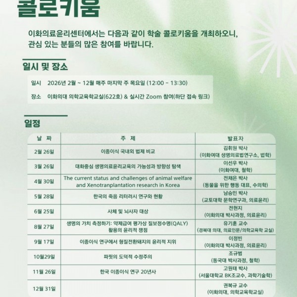 [의료윤리 콜로키움] 의료 윤리에 관심있는 여러분을 초대합니다. 페이지 정보 작성자 최고관리자 댓글 0건 조회 1회 작성일 26-02-14 13:18 본문 많은 관심 부탁드립니다. 목록 다음글 [공동성명] 판다 임대 계획 당장 철회하라 댓글목록 댓글목록 등록된 댓글이 없습니다.